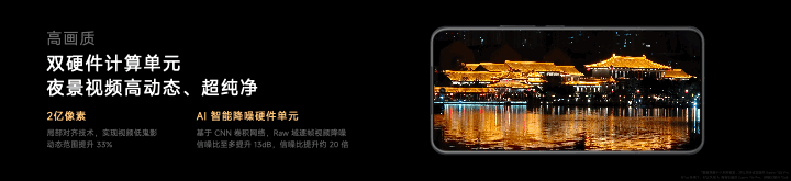 不仅如此,我们还将实时多帧 HDR 融合和 AI 智能降噪硬化在 ISP 中,让视频动态范围更高、“鬼影”更小。特别是夜景视频,每一帧画面都能 AI 智能降噪,极暗光环境下,信噪比最高提升 20 倍,夜景更加纯净。还特别支持了全焦段 4K 夜景视频。