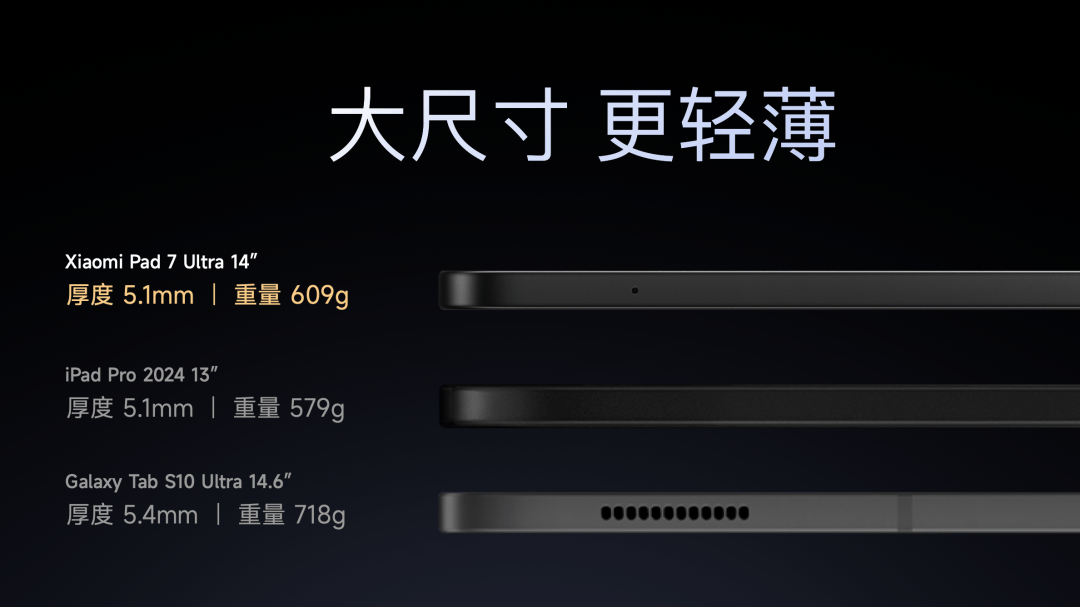 小米平板7 Ultra 采用全金属一体化外观设计,极致轻薄。整机厚度 5.1 mm,重量 609g,携带无负担。共有黑色、迷雾灰紫两款配色可选。