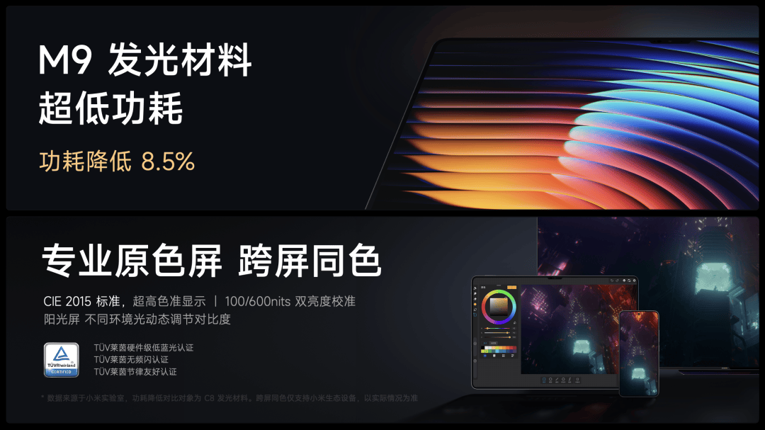 采用小米 15 系列同款的 M9 低功耗发光材料,同亮度下,对比 C8 发光材料屏幕功耗降低了 8.5%,它还是一块专业原色屏,支持小米生态多屏同色。