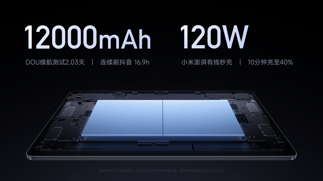 虽然轻薄,但依然有 12000mAh 高容量电池,无论是视频播放、在线会议还是游戏娱乐,都可提供超持久的续航体验。使用更好的 120W 超快充电方案,充电 10 分钟就能充到 40%,并且支持 7.5W 的反向充电。