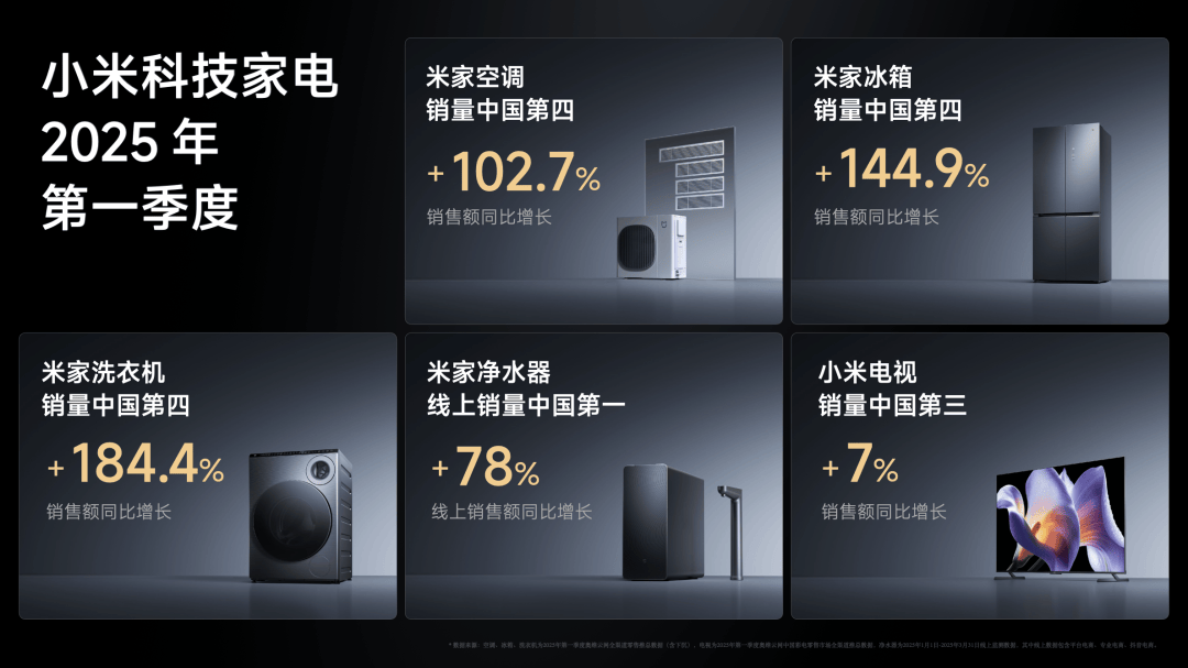 小米的战略是「人车家全生态」,过去几年,小米的科技家电表现非常出色。今年一季度的销量份额里,空冰洗都排到了中国第四、净水器线上第一、小米电视国内第三,同时销售额大幅度增强,尤其是备受关注的空调业务,增速超过 100%。2 月份我们还发布了家庭中央空调,销量也特别好。如果让我用一个词来形容小米的科技家电,那就是“气势如虹”。