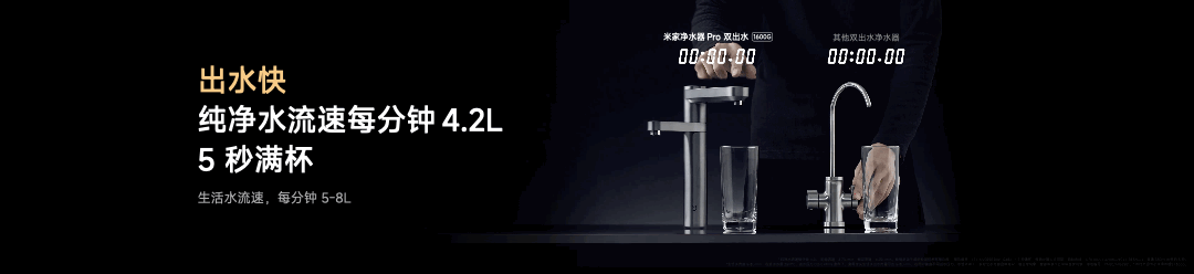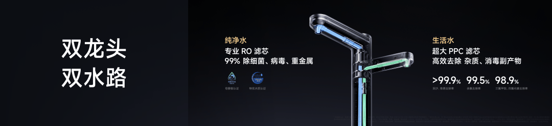 生活水,则配备超大的PPC滤芯,可以 98% 以上的去除自来水中的泥沙、铁锈、氯和消毒副产物,满足洗菜、刷碗、淘米的需求。流速达到 5-8L/min,速度基本跟自来水一样。内置 PPC 滤芯最长可用 1.5 年,换芯仅需 299 元。