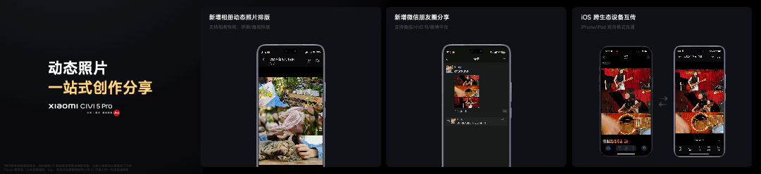 更特别的是,小米Civi 5 Pro 支持动态照片一站式创作分享,新增全链路编辑,可以直接在相册内拼图、排版;新增动态照片分享至微信、小红书、微博平台;还可与 iOS 设备互传动态照片,让创作更加自由。