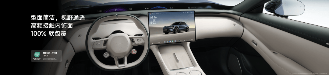 内饰整个型面简洁而饱满,仪表台很薄,视野非常通透。人高频接触的部位,我们都做了 100% 软包覆盖,并获得了国际一级认证,甚至达到了婴儿能直接碰触的标准,带娃以及皮肤敏感的朋友都可以安心。