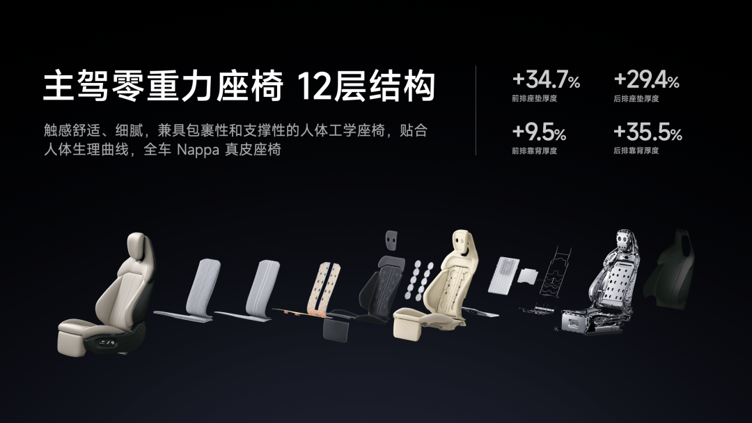 这次在座椅上,我们也下了功夫,全车座椅采用 Nappa 包覆,触感非常细腻。主驾副驾都配备了零重力座椅,支持 10 点式按摩。主驾零重力座椅采用 12 层结构,更厚、更软。*数据来自小米汽车实验室,对比对象为Xiaomi SU7,图为主驾零重力按摩椅拆解示意,Nappa 真皮覆盖区域为座椅打孔区域;12层结构指面套、透气复合层、透气网布、加热层、零压感软海绵、按摩气袋、高密度海绵、通风气袋、腰托气袋、悬簧、轻量化骨架、座椅背板