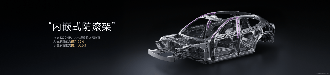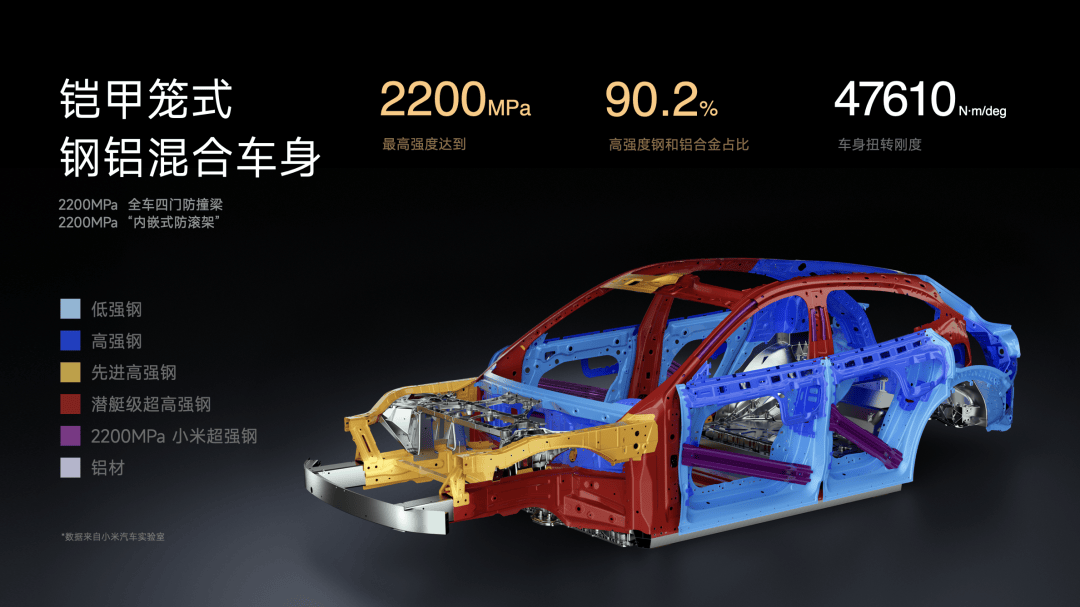 我们和国内知名的科研团队、大学合作开发了 2200MPa 小米超强钢,它是目前汽车行业中最强的热成型钢,使用在四门防撞梁上,能有效提升侧面碰撞中的乘员舱保护,前门防撞梁承载能力提升 52.4%,后门防撞梁承载能力提升 37.6%。