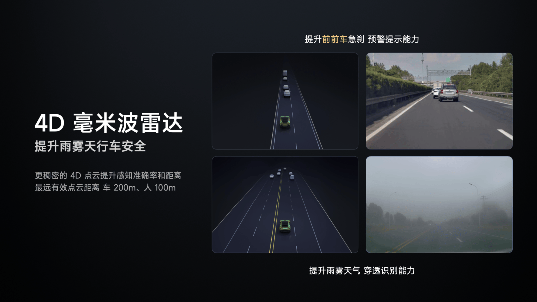 4D 毫米波雷达,分辨率与识别距离也大幅强化,在一些复杂场景,比如跟车时,前车急刹,辅助驾驶系统也可以增强检测和预警。当雨雾等恶劣天气时,哪怕能见度很低,4D 毫米波雷达也能更好地感应。