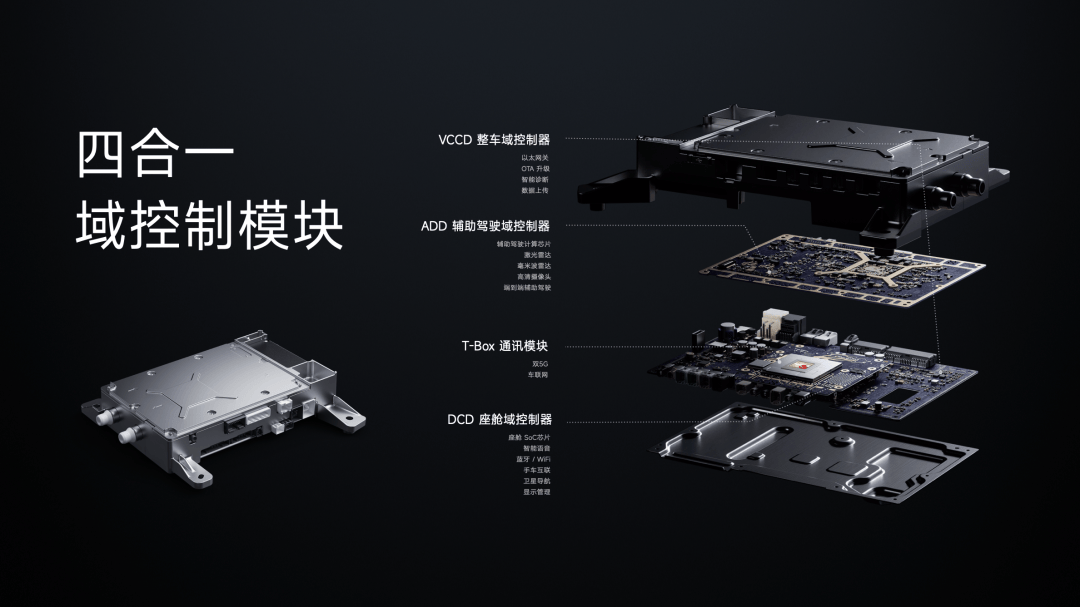 我们在小米YU7 上做了一个四合一的域控制器,相当于一个集成度很高的中央大脑,把辅助驾驶、智能座舱、整车控制器和通讯模块,几十个功能模块都合到了一起,高度集成。(图示仅为示意)