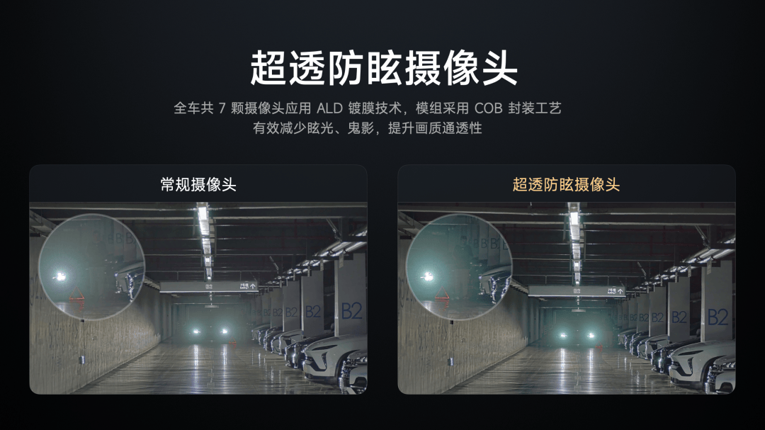 对于车载摄像头来说,眩光干扰一直是很大的难题,小米YU7 全车有 7 颗摄像头增加 ALD 镀膜,能较好的抑制逆光、眩光产生的视觉干扰,画质更加清晰、通透,驾驶更安全。